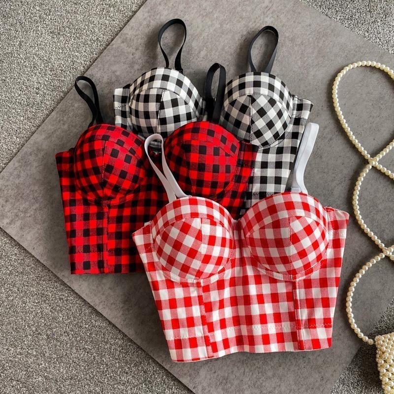 High-end Temperament Checkered Halter Vest Women Short Small square Printed Fishbone Spice Girl Top Spread Chest