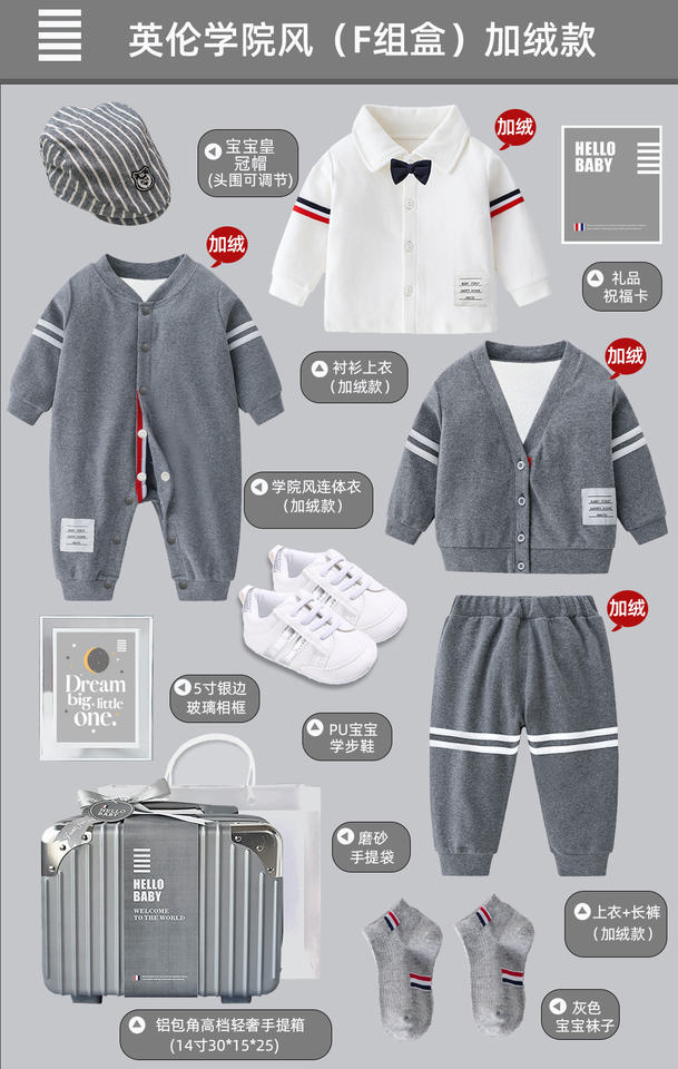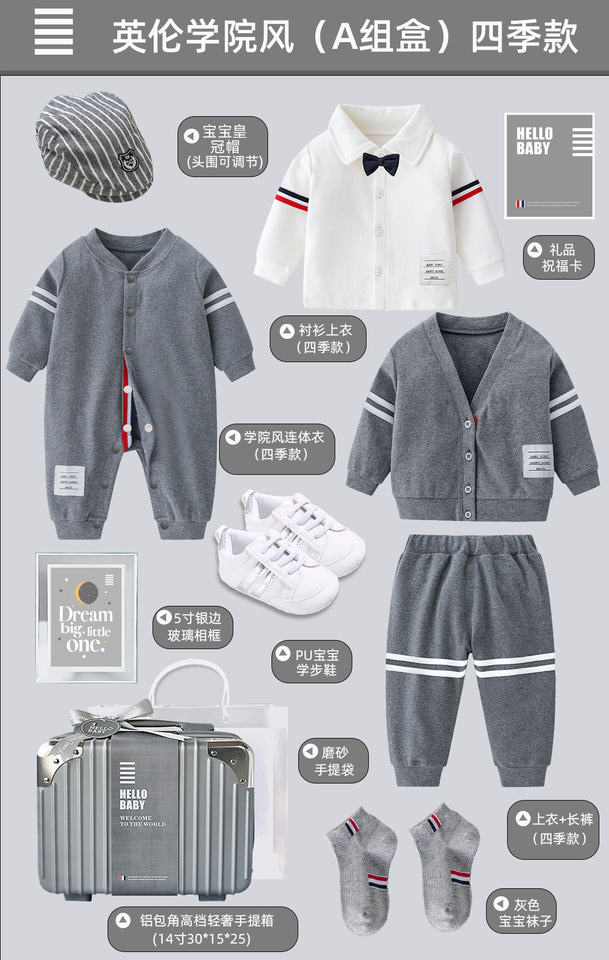 High end college style newborn gray jumpsuit for baby boys, foldable baby shirt jacket gift box, one year old gift item