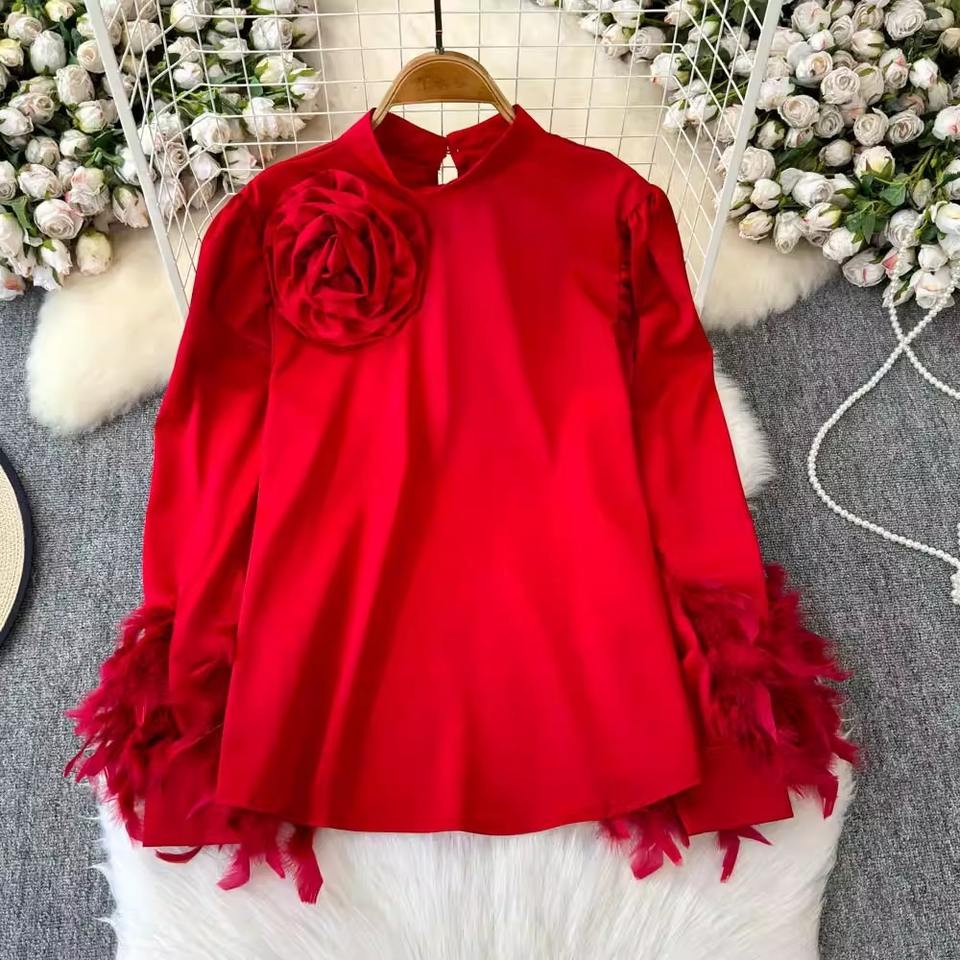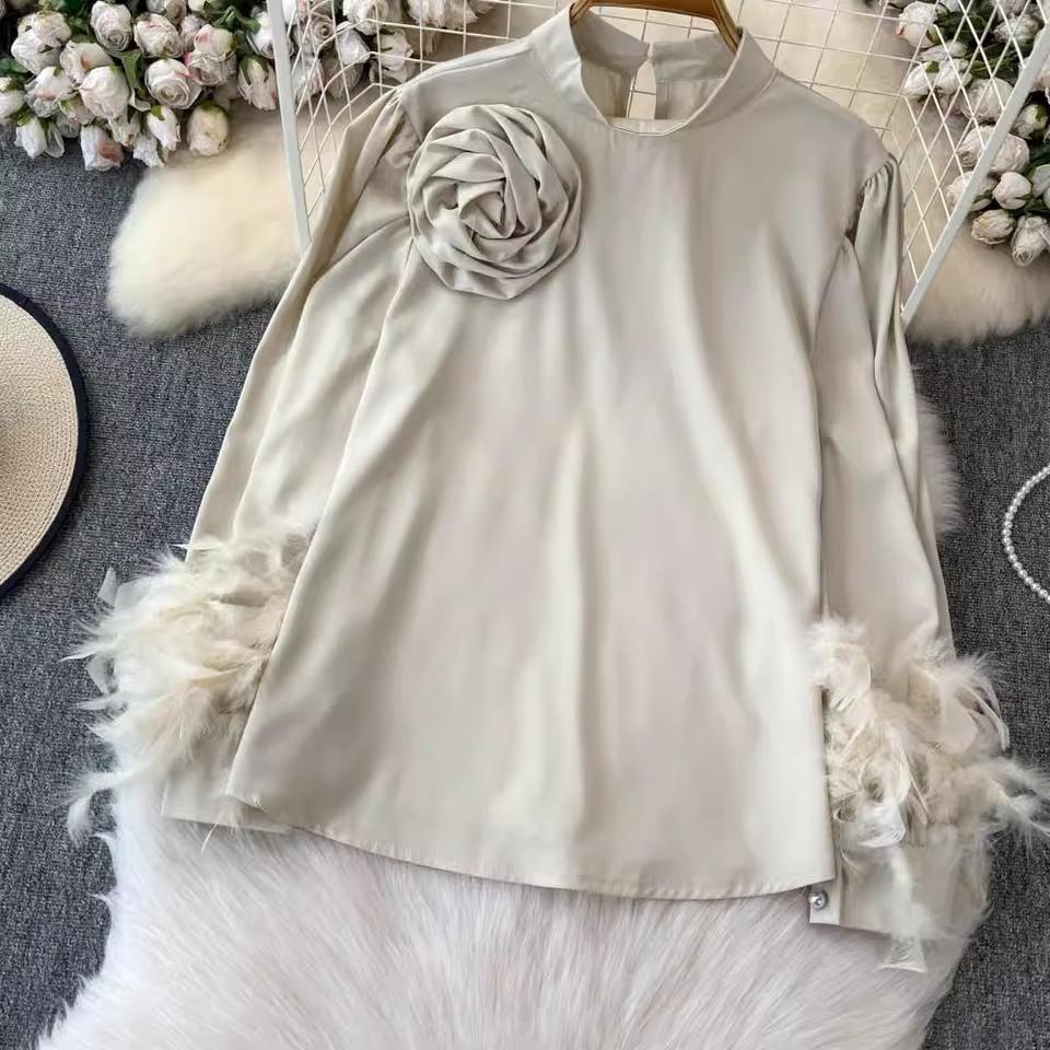 High-grade Satin Shirt for Women French Style Light Luxury Elegant Flower Lantern Sleeves Loose and Slim Tops with Feathers