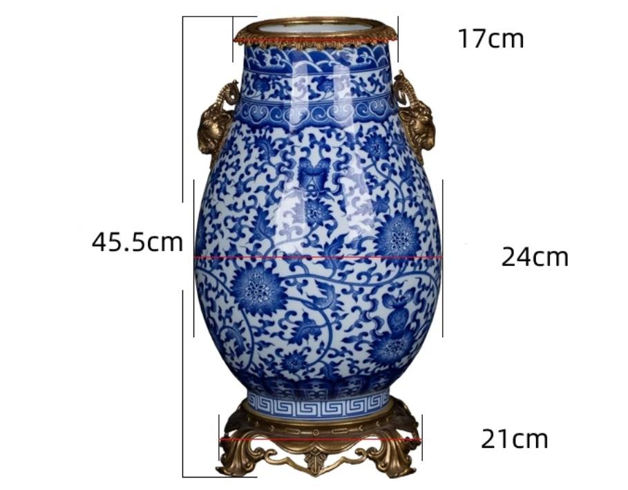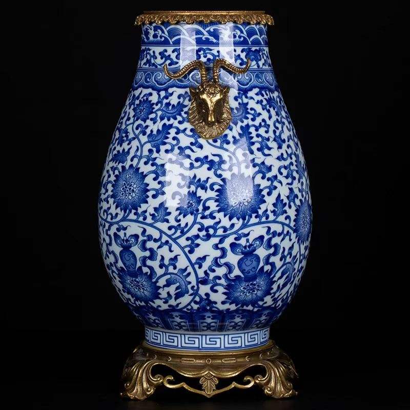 Vaso antico in porcellana blu e bianca di alto valore, di forma ovale, con manico e base a testa di capra in ottone.