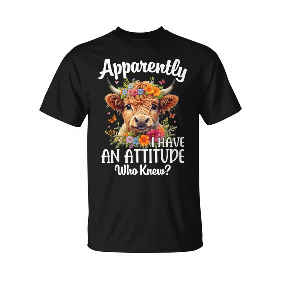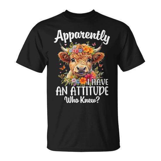 T-shirt con stampa Highland Cow. Apparentemente ho un'attitudine, chi lo sa, design nero, per adulti, unisex