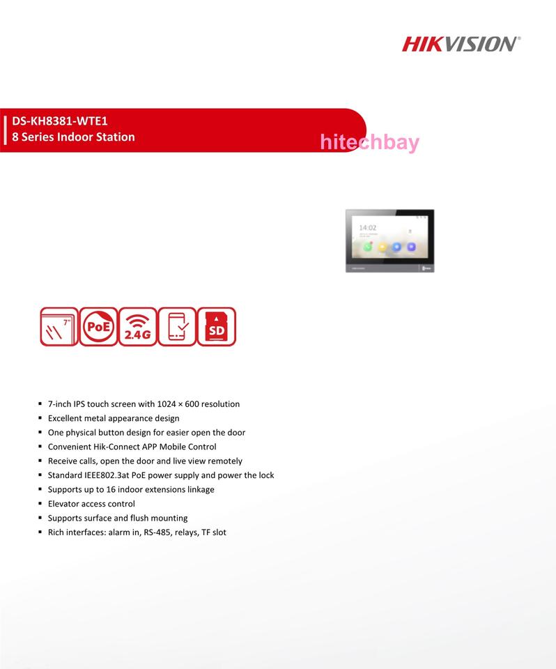 Hik Original DS-KH8381-WTE1 Indoor Station Monitor 7-Inch IPS Touchscreen POE WIFI IP Video Intercom 1 Physical Button Open Door