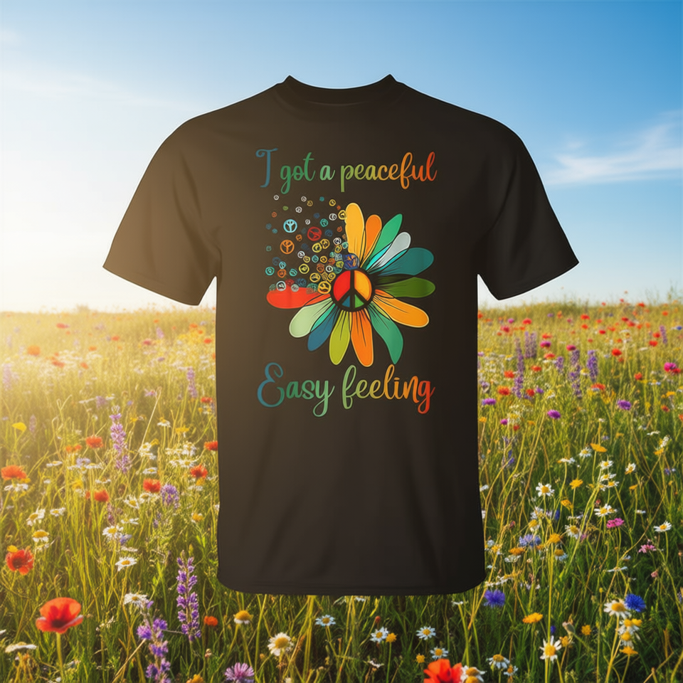 T-shirt Hippie Peaceful Easy Feeling con design a girasole e simbolo della pace