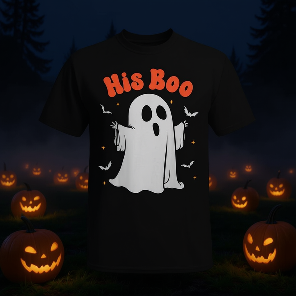 T-shirt His Boo Halloween Ghost dal design coordinato per coppie, manica corta nera