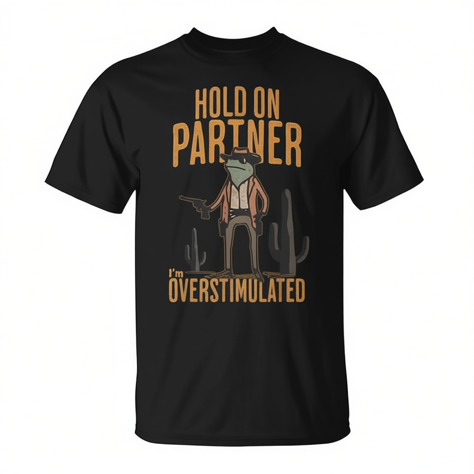T-shirt Unisex da Adulto a Girocollo a Maniche Corte con Stampa 'Hold on Partner I'm Overstimulated Cowboy Frog' - Modello A8005