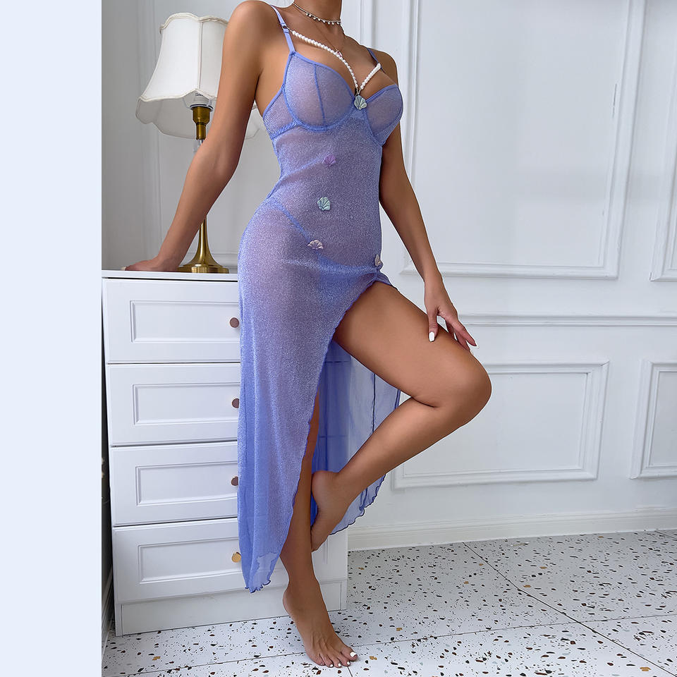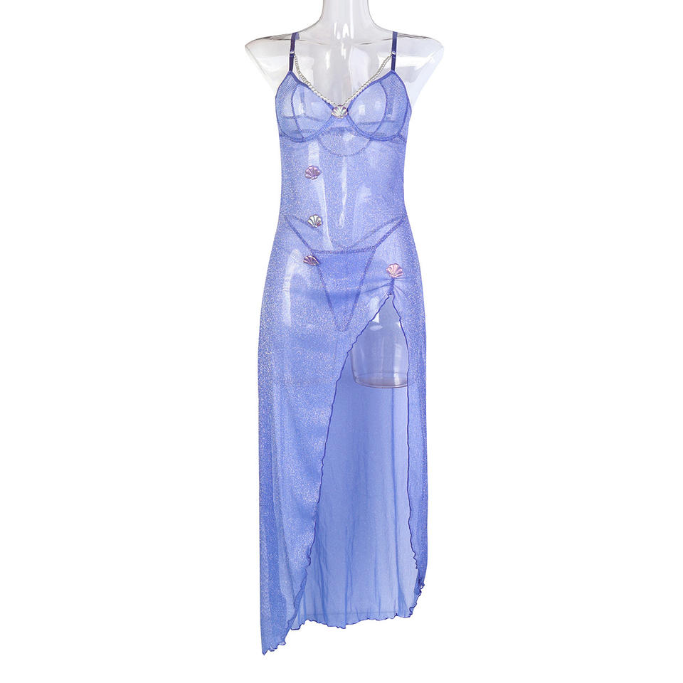 Set di Lingerie Sexy in Rete Trasparente con Dettagli Blu e Gialli a Contrasto, Abito in Rete Bianco Neve, Completo Intimo Sexy