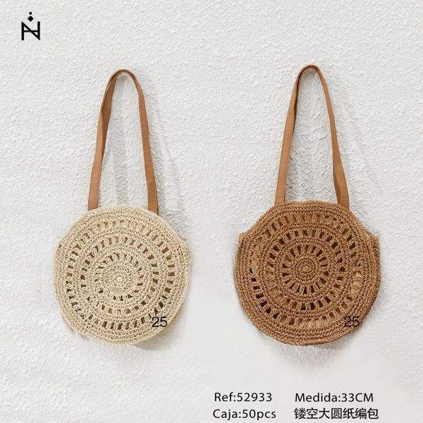 Borsa a tracolla grande rotonda in carta intrecciata traforata 33CM beige e marrone da donna per l'estate e la spiaggia