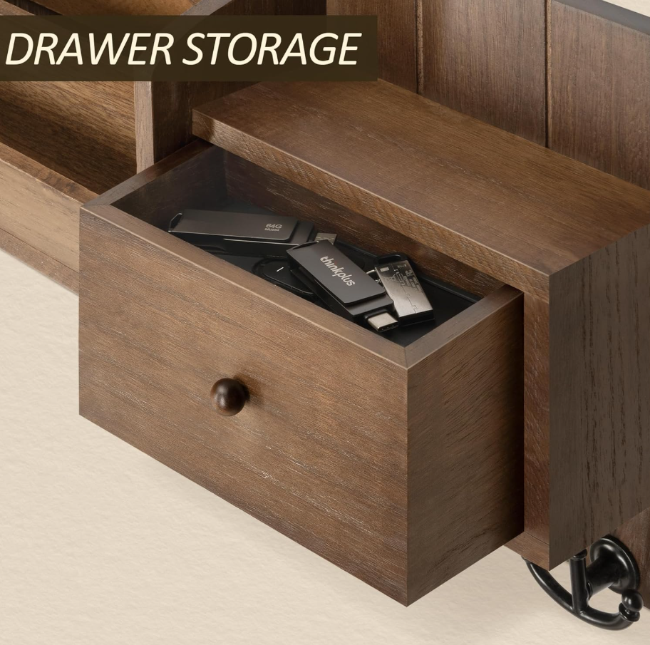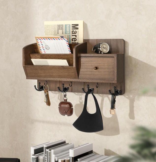 Home Decor Wooden Wall Mounted Hanging Magazine Mail Organizer Shelves Rack Key Holder with Hooks Drawer
