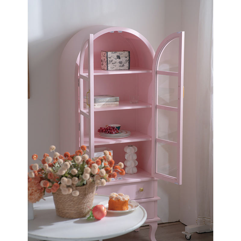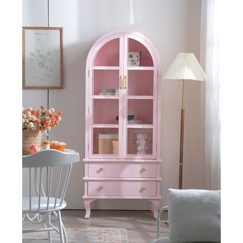 Home Nordic Decors Arch Storage Sideboard Vintage Glass Door Pink Solid Wood Drawer Cabinet for Dining Room