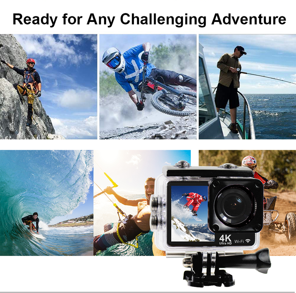 Nuova Action Cam Sportiva 20M Pixel 4K 60FPS con Doppio Schermo a Colori, EIS a 6 Assi, Connessione WIFI, Impermeabile fino a 30M con Custodia