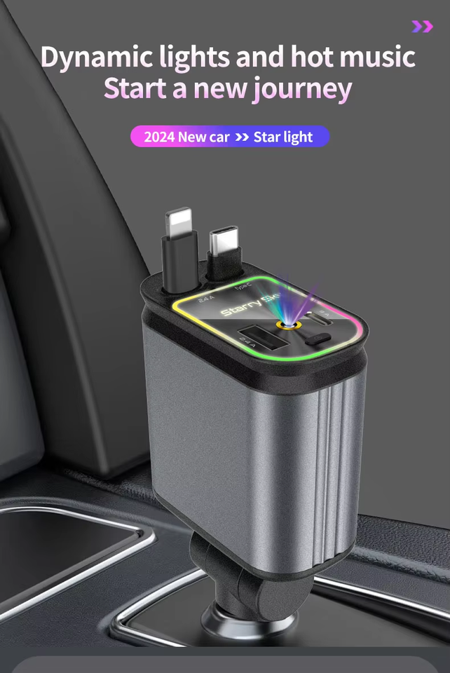 Caricabatterie per auto con cavi retrattili 4 in 1 con luce a stella con ricarica rapida USB C