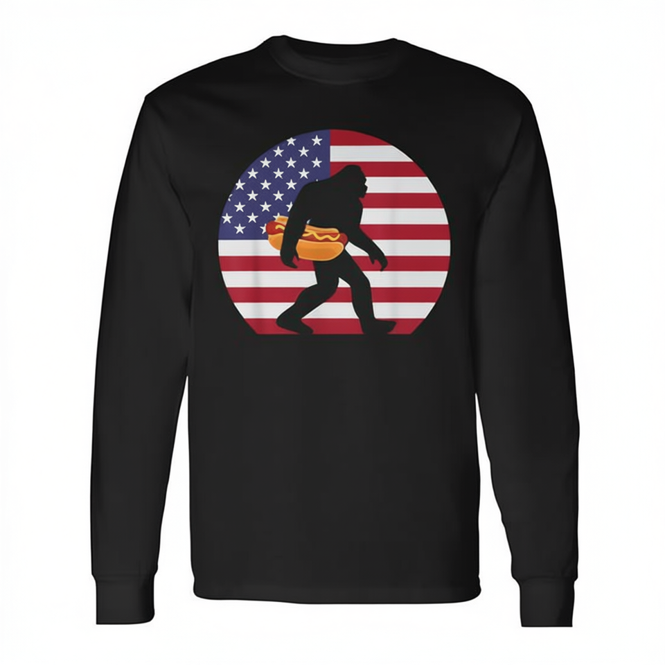 Maglietta a Maniche Lunghe con Bandiera USA e Hot Dog, Unisex per Adulti, Girocollo, per Attività Promozionali, Stampa Serigrafica
