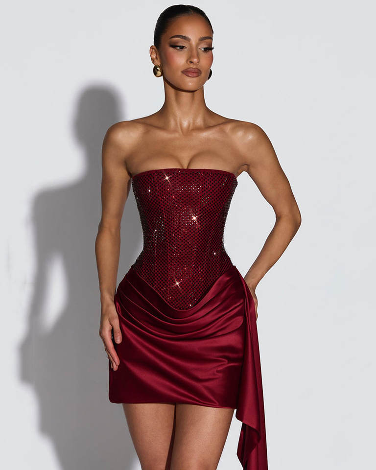 Abito Mini Sexy con Strass Termoadesivi e Arricciature per Donna, Elegante Vestito Senza Spalline e Senza Maniche con Lacci Posteriori per Club e Feste