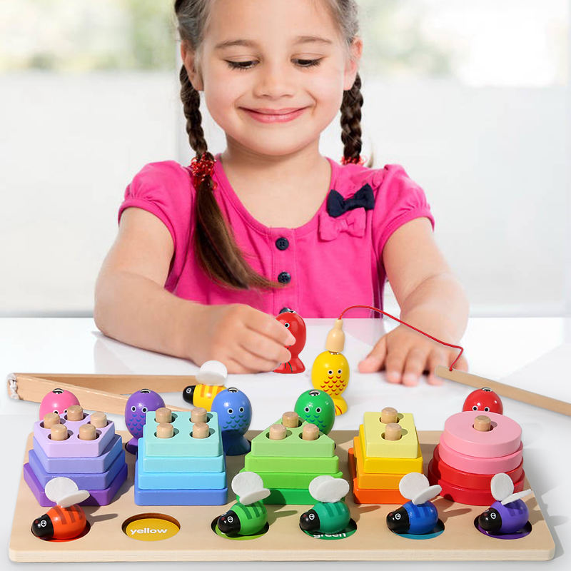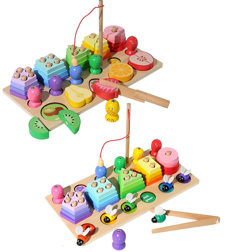Hot New Product Wooden 3 in 1 Bee Fruit Toy Puzzle Early Education Geometric Shapes Paired Fishing Montessori Toys for Children
