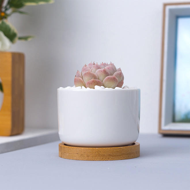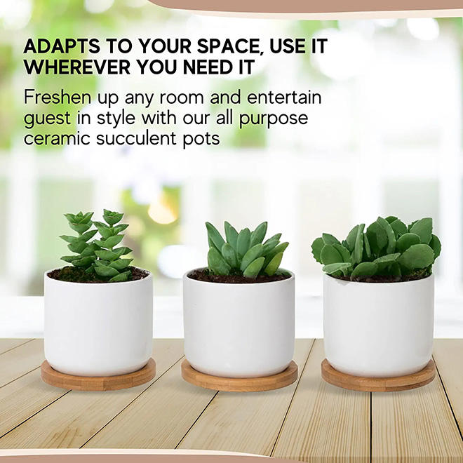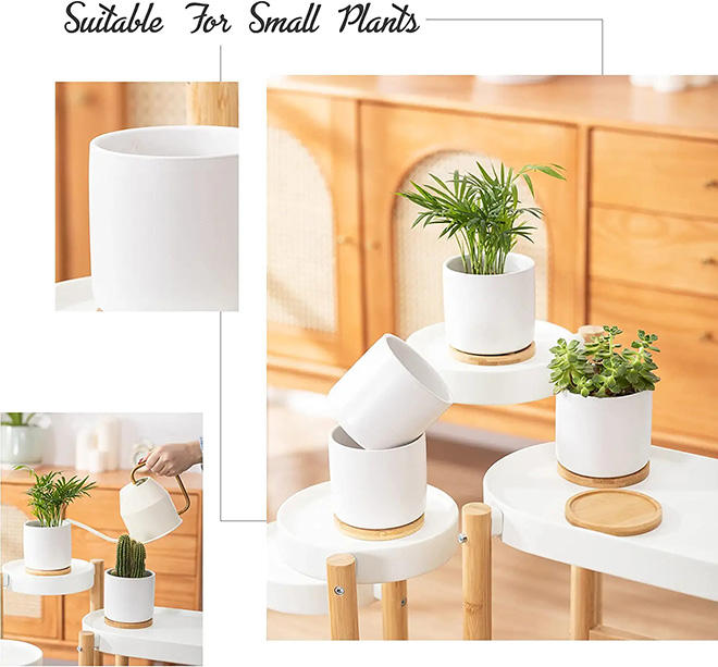 Vendita calda vasi per piante cilindrici bianchi in ceramica da 3.5 pollici con fori di drenaggio vassoi in bambù fioriera moderna per succulente