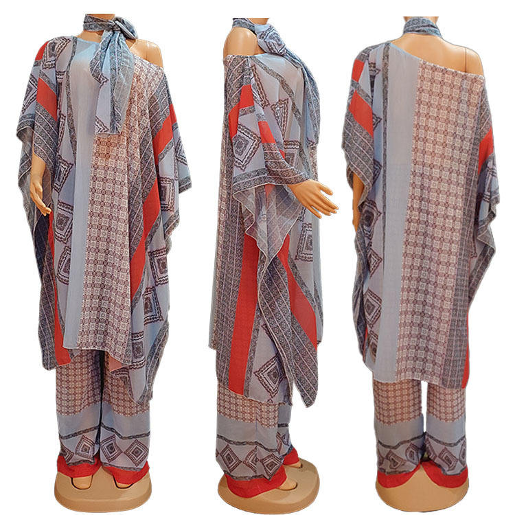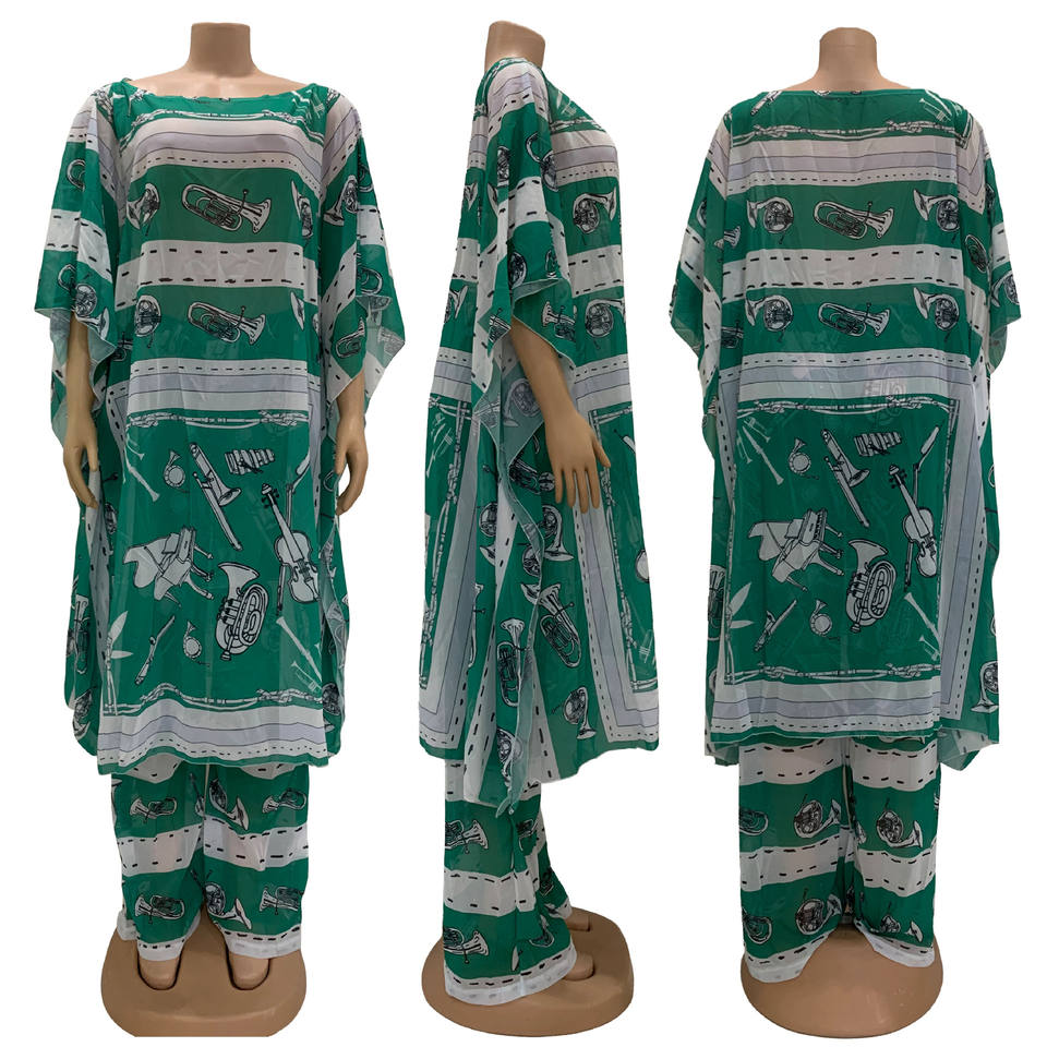 Hot Sale Chiffon Printed Long Dresses and Pants Plus Size Women Two Piece Set