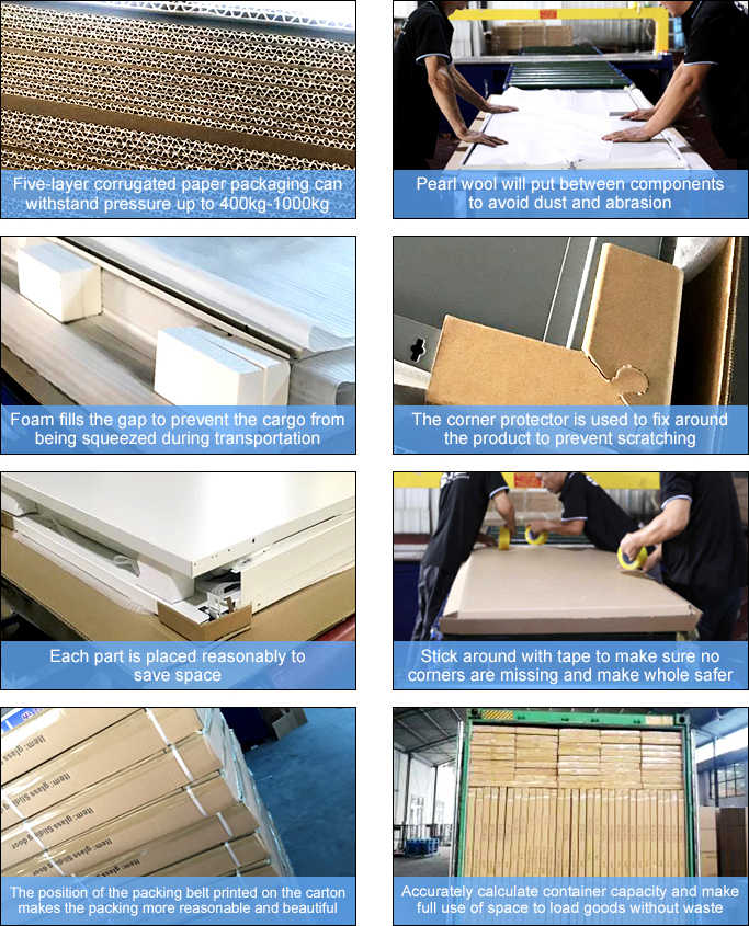 Five layers of corrugated paper, pearl wool sandwiched between two layers of steel plates, foam blocks are used to fill the gaps. There are corners around, and the location of the packing belt is printed on the carton, and the tape is surrounded