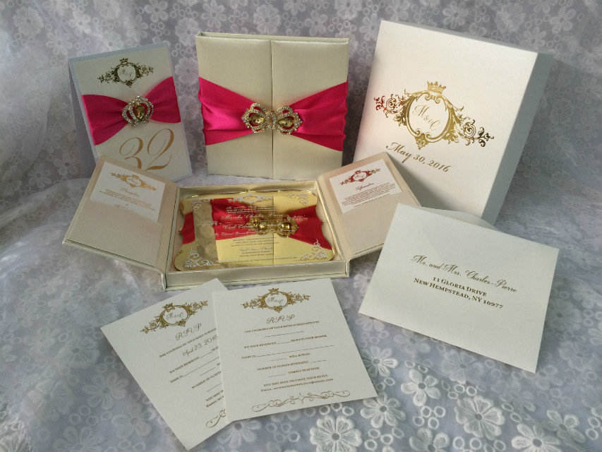 Biglietti d'invito per matrimonio con scatola di seta di lusso di vendita calda con nastri e spille con strass