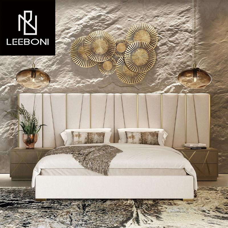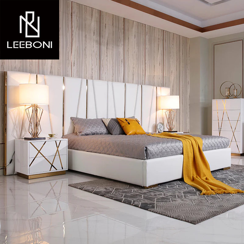 Hot Sale Post Modern European Bedroom Furniture Sets Luxury Leather Double Bed Wide Headboard White Leather king Size Bed