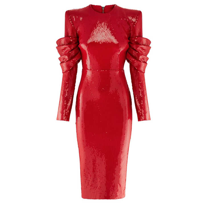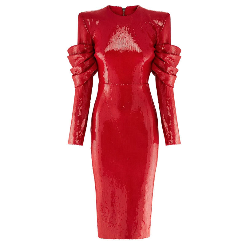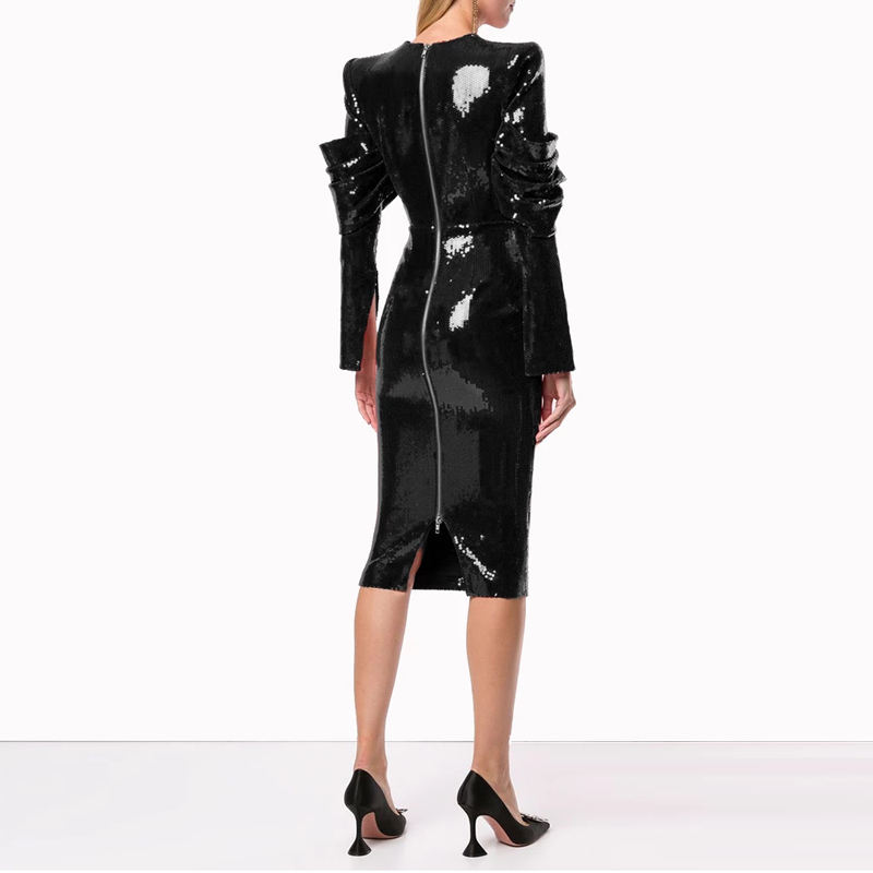 Hot Sale Round Neck Long Sleeve Structured Shoulder Sequined Dress Back Zip Stylish Draped Details Party Midi Dresses YLDR002ZC