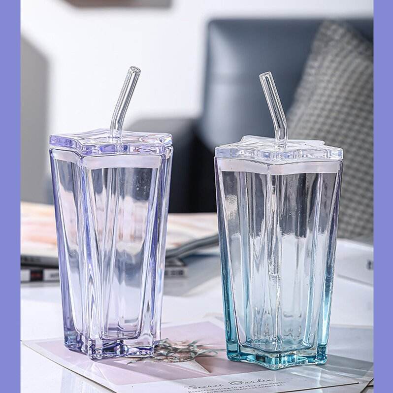 Tazza da Caffè in Vetro Colorato con Stella a Cinque Punte, Bicchiere per Bevande Fredde con Coperchio e Cannuccia