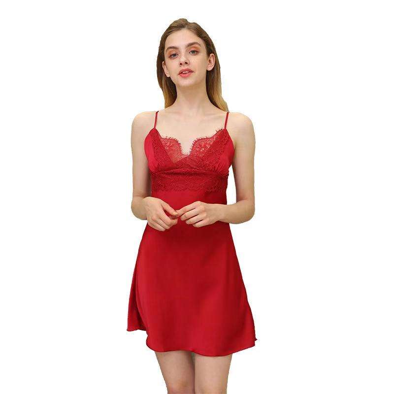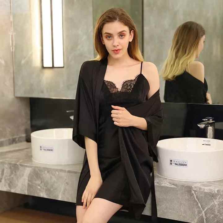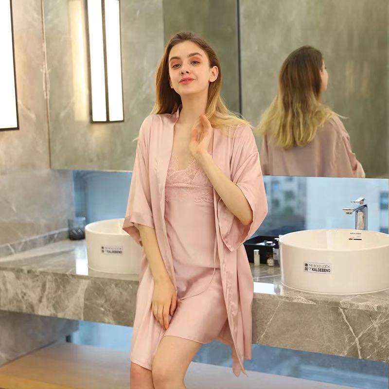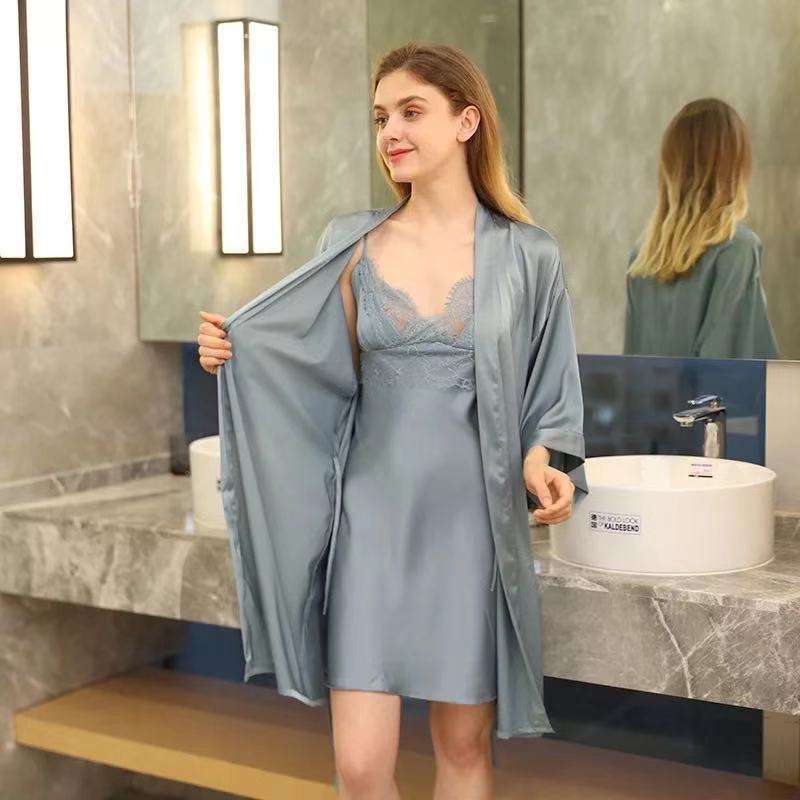Hot Sale Summer Women's Sexy Lace Pajamas Set Knee-Length Night Gown with Thermal Woven Silk Satin Robe for Spring Season