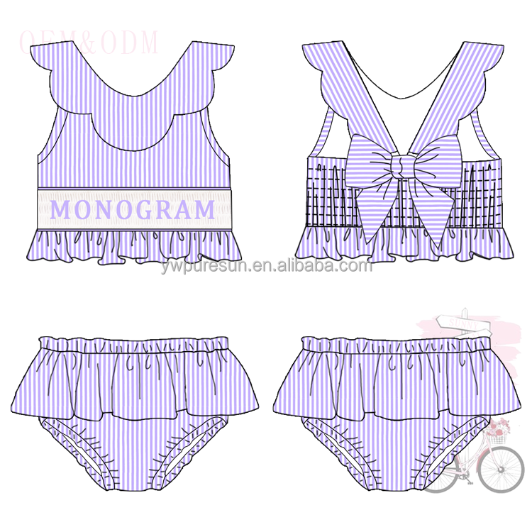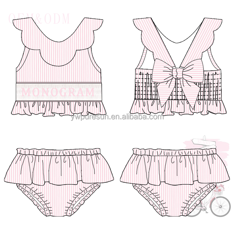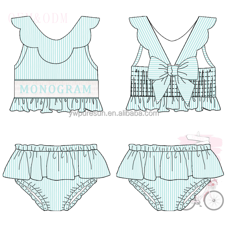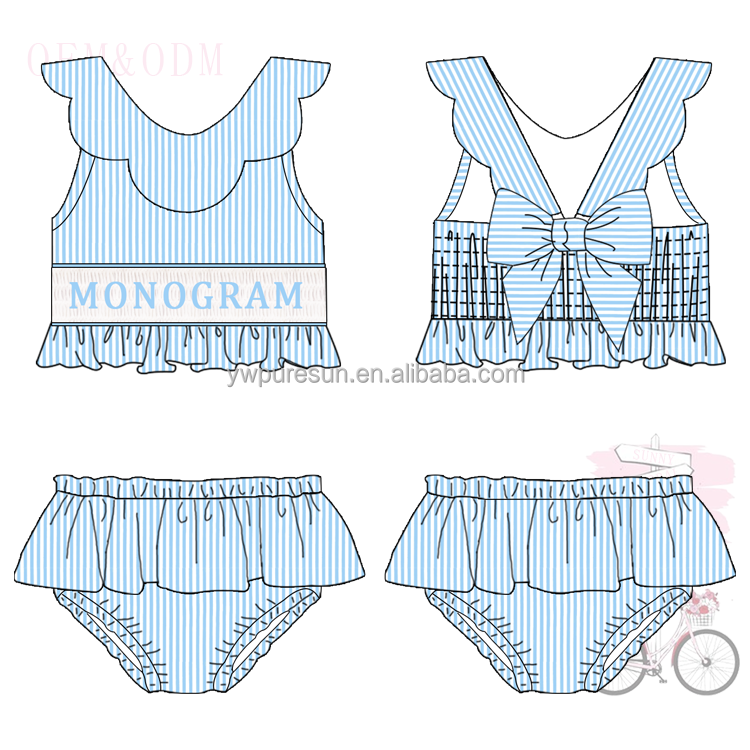 Hot Sale Toddler Girls Bathsuit Seersucker 2 Pieces Lined Swimsuit Smocked with Monogram Children Wear Scallop Ruffles Bikini