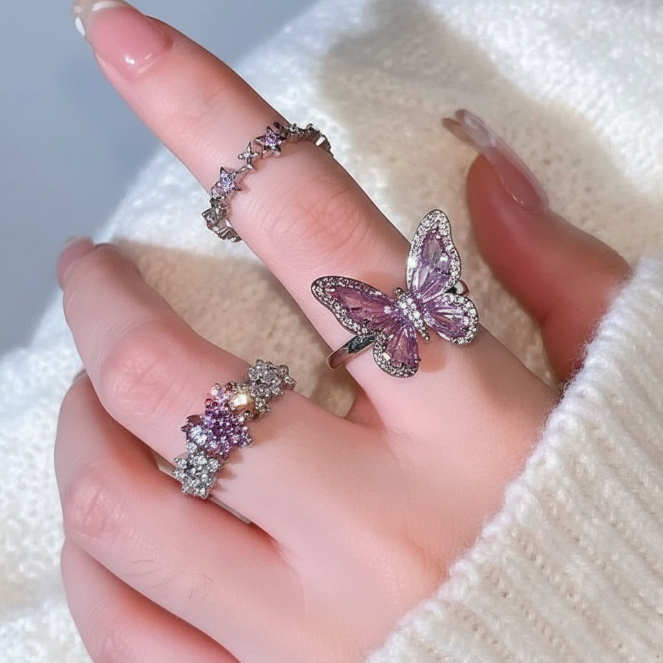 Hot Sale Trending Luxury Silver Star Inlay Ring Girls' Adjustable Fashion Statement with Rose Gold Plating Wholesale
