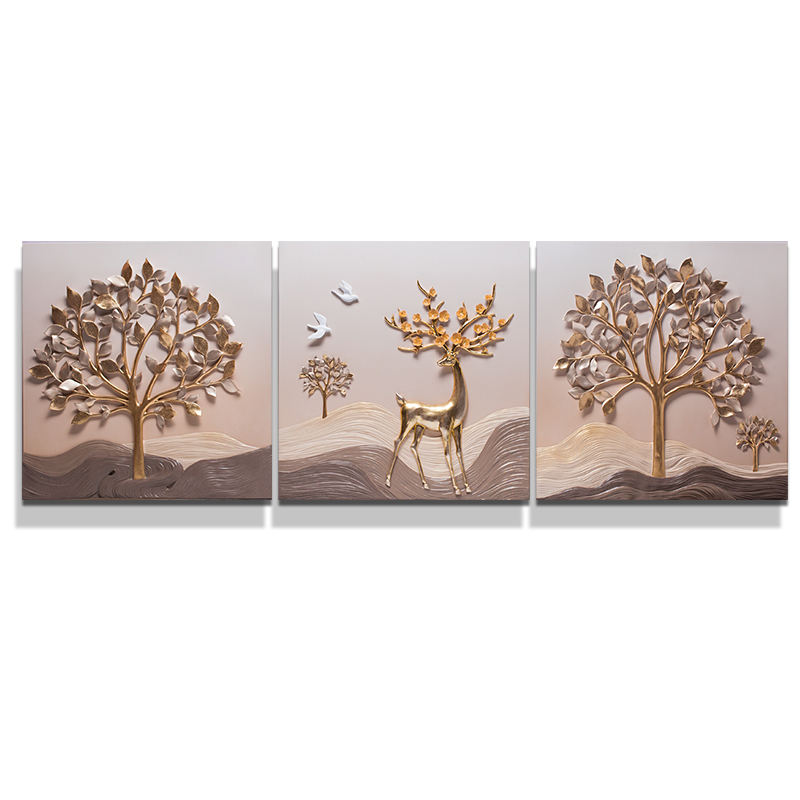 Hot Sales 3d Deer Painting Golden Tree Handmade Wooden Art Wall Decor