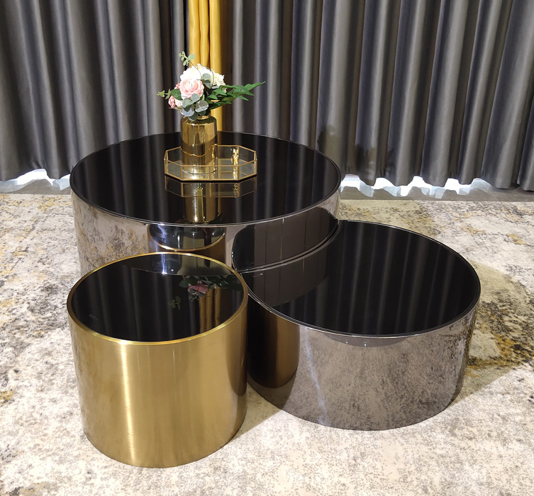 Vendite calde Creative in vetro Top tavolino da caffè lucido oro opaco struttura in acciaio inox legno centro in marmo tre dimensioni disponibili