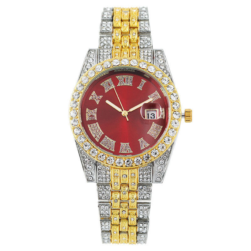 Hot Sell Eight Different Colors Alloy with Full Rhinestone Iced Out Hip Hop Calendar Women's Round Roman Scale Quartz Watch