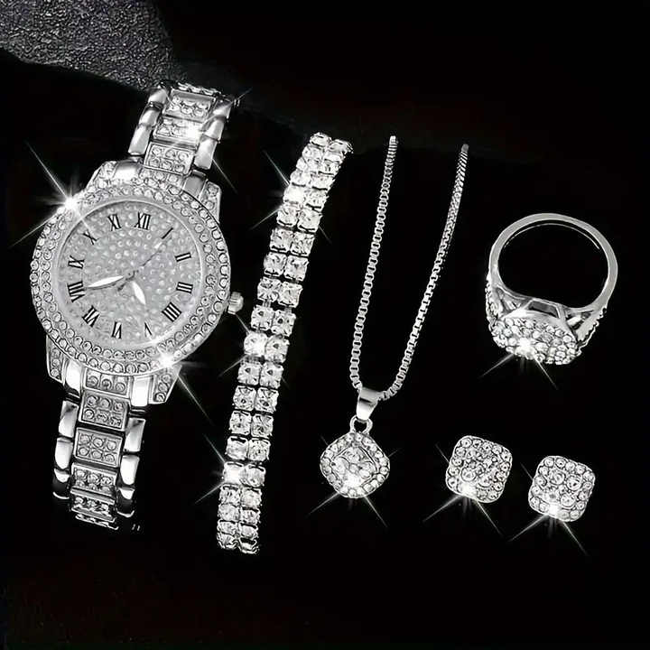 Set di Gioielli da Donna in Lega d'Oro, Argento e Oro Rosa con Strass Luccicanti, Collana, Bracciale, Anelli, Orecchini e Orologio Hip Hop