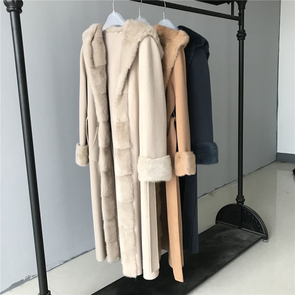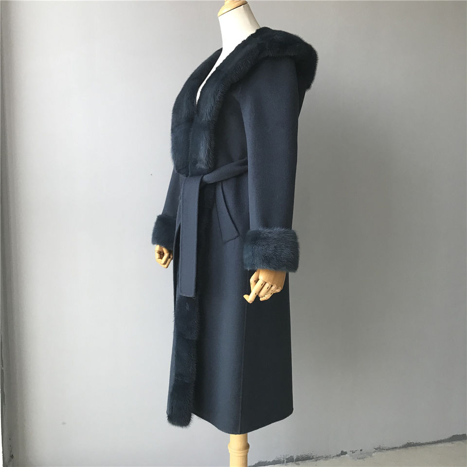 Hot Sell Premium Mink Collar Women Long Coat Hooded Winter Fashionable Cashmere Wool Blend Coat