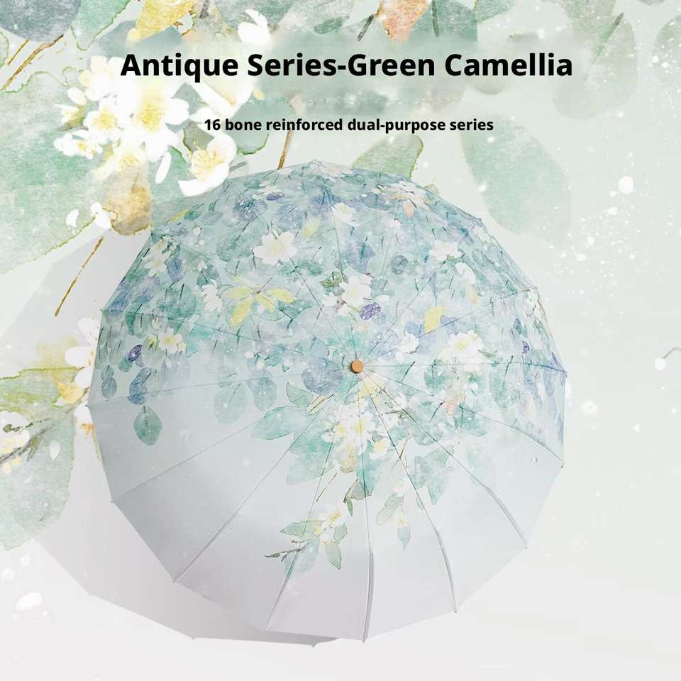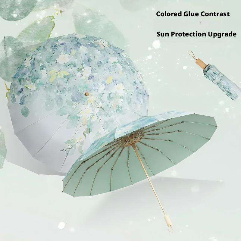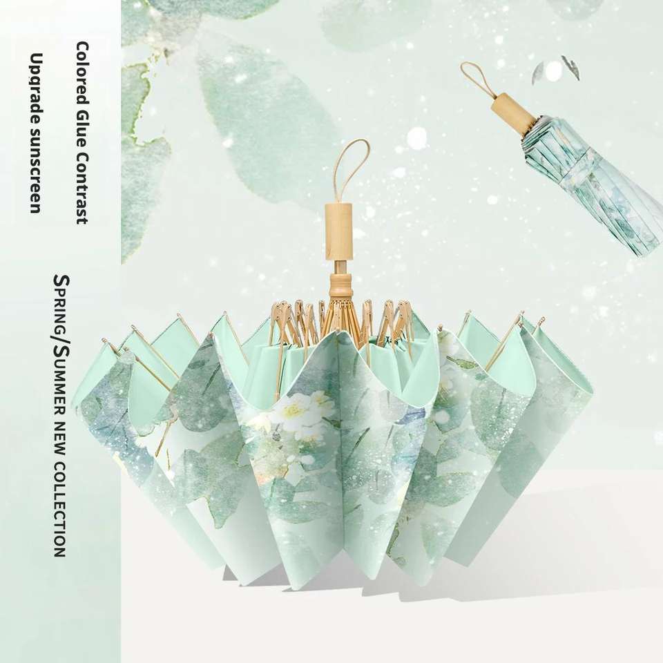Vendita calda a 16 colori con osso in gomma a doppio uso ombrellone in legno con manico pieghevole High-End sensazione di protezione da sole e UV