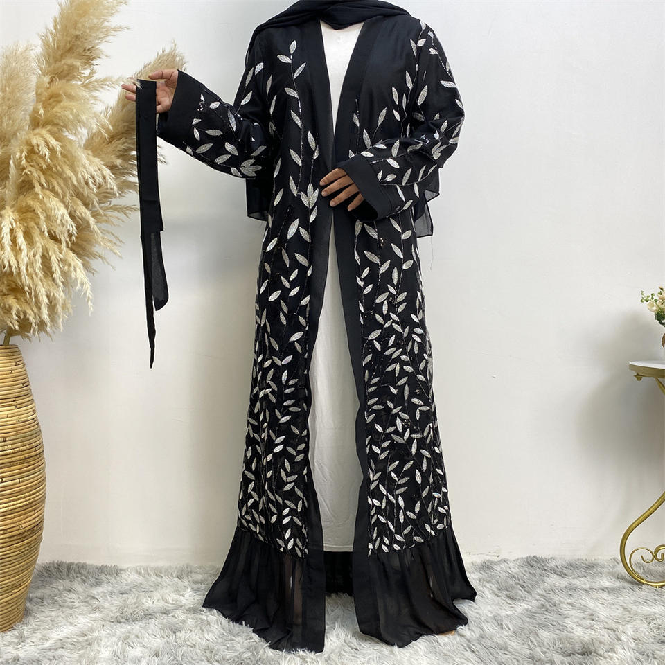 Nuovo prodotto di vendita a caldo Cardigan di temperamento di pizzo da donna di moda mediorientale con ricamo a foglia di Abaya musulmano con paillettes Rob