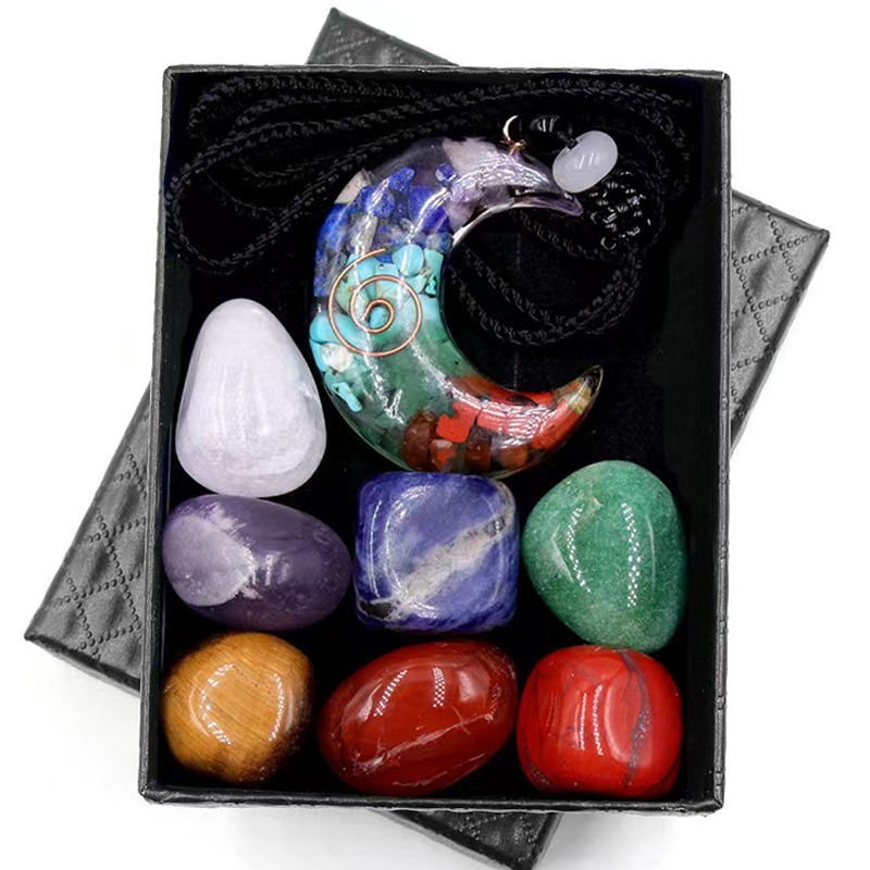 Hot Selling Spiritual Meditation Crystal Moon and Star Healing Crystal 7 Chakra Tumbling Stone Box Set