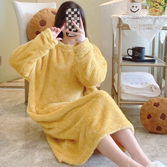 Hot Selling Women's Flannel Nightgown for Autumn Winter Solid Color Loose Large Size Long Sleeved Thermal Fashion Home Clothes