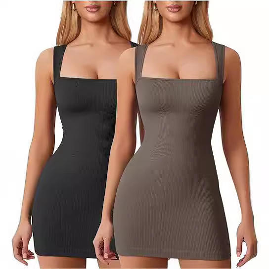 Hot Selling Women's Mini Dress with Sexy Ribbed Lace up square Neck Vest Dress