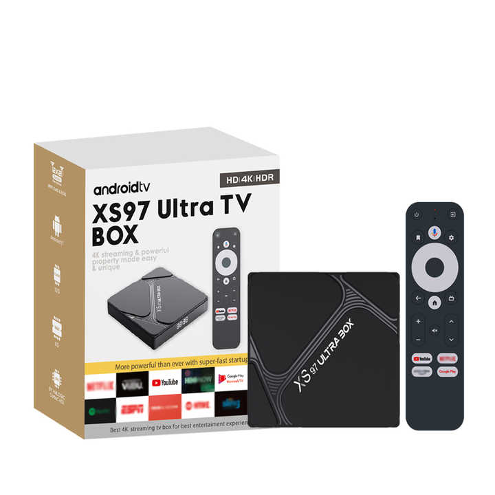 Decoder Android TV XS97 Ultra Box 4K H.265 con YouTube, lettore multimediale STB, prodotto in fabbrica, molto venduto.