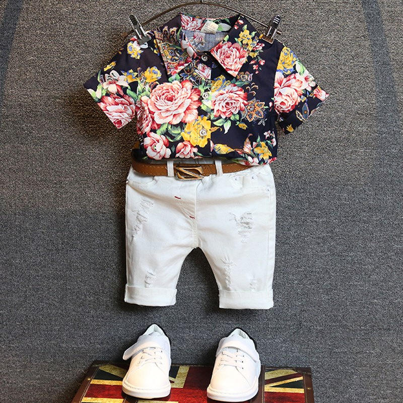 Hot Style Kids Outfits Summer Short Sleeve Shirt+Shorts 2pcs 100% Cotton Flowers Print Casual Boy Clothing Set