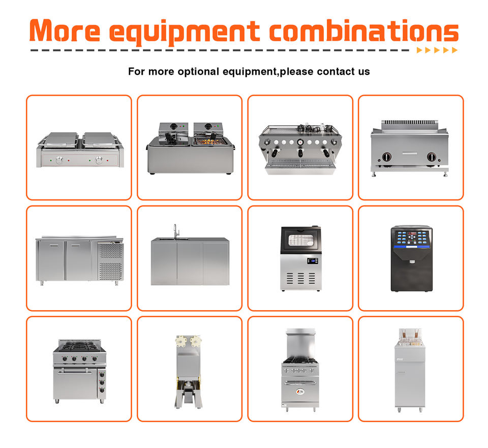 Polli da carne, Griglia carbone, Fornello a bruciatore, Friggitrice, Gamma combinata, Piastra, Griglia piatta, Microonde, Spazio di preparazione, Pressa per Panini, Forno, Forno per Pizza, Salamandra, Affettatrice, Insalatiera