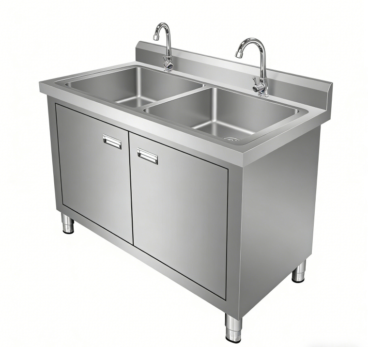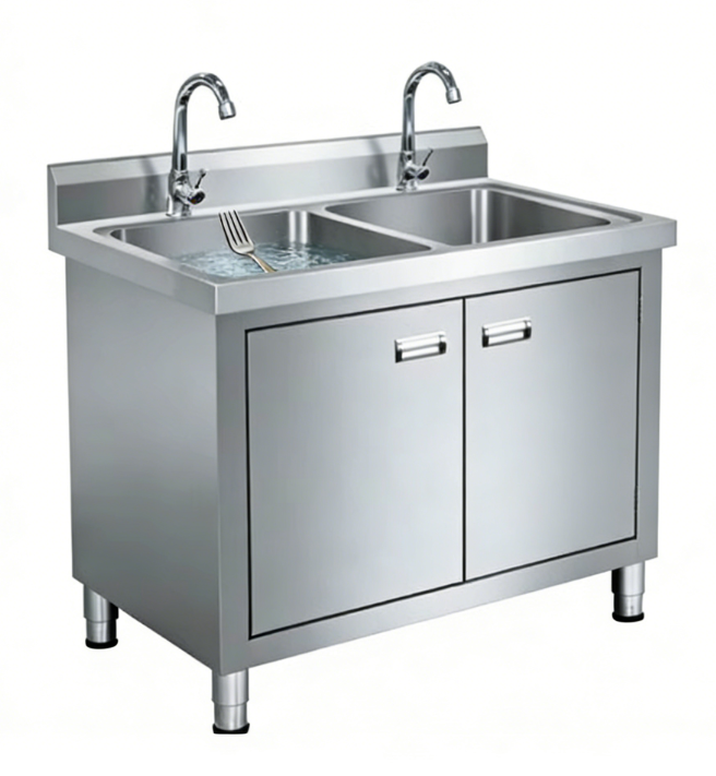 Hotel Kitchen Dishwashing Station, Stainless Steel, Stable Adjustable Feet Catering Double Bowl Sink with Under Cabinet
