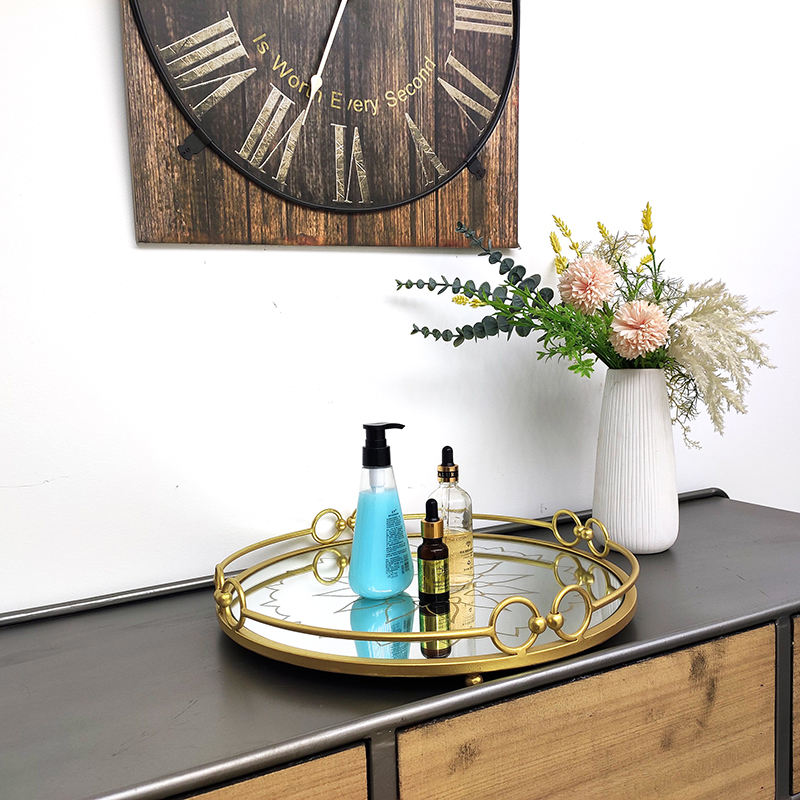 Hotel Room Toiletries Luxury Round Metal Glass Mirror Makeup Jewelry Display Tray Dressers- Round Decorative Serving Tray