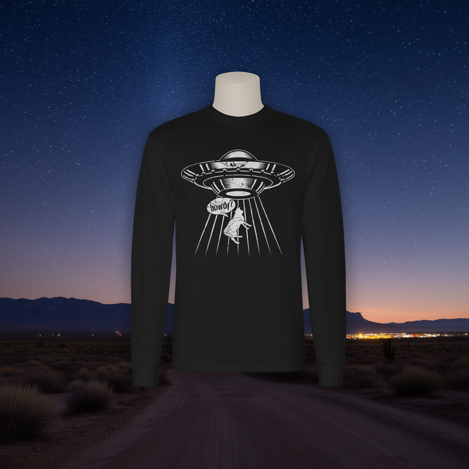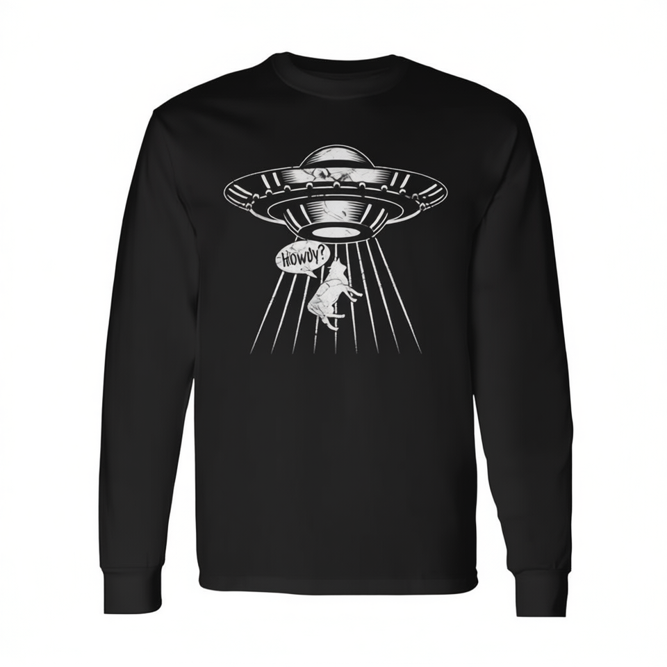 T-shirt a maniche lunghe Howdy Western Usa Cowboy Ufo Alien Abduction