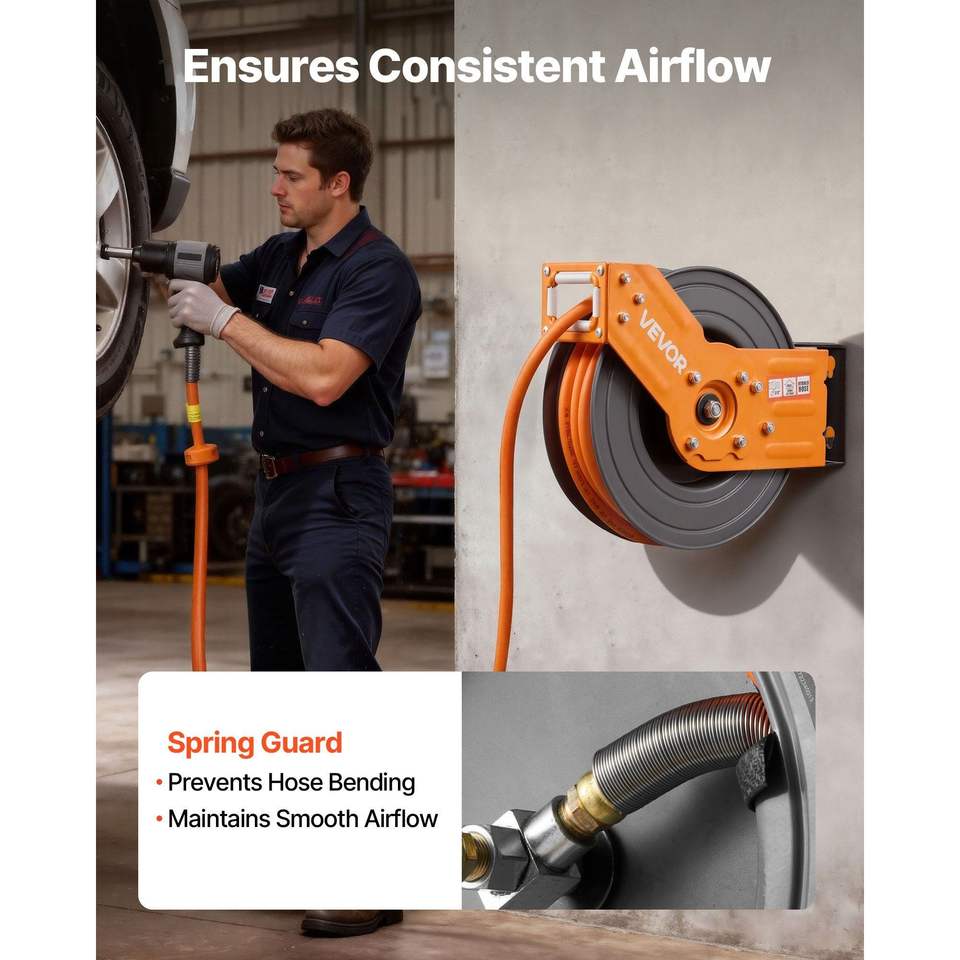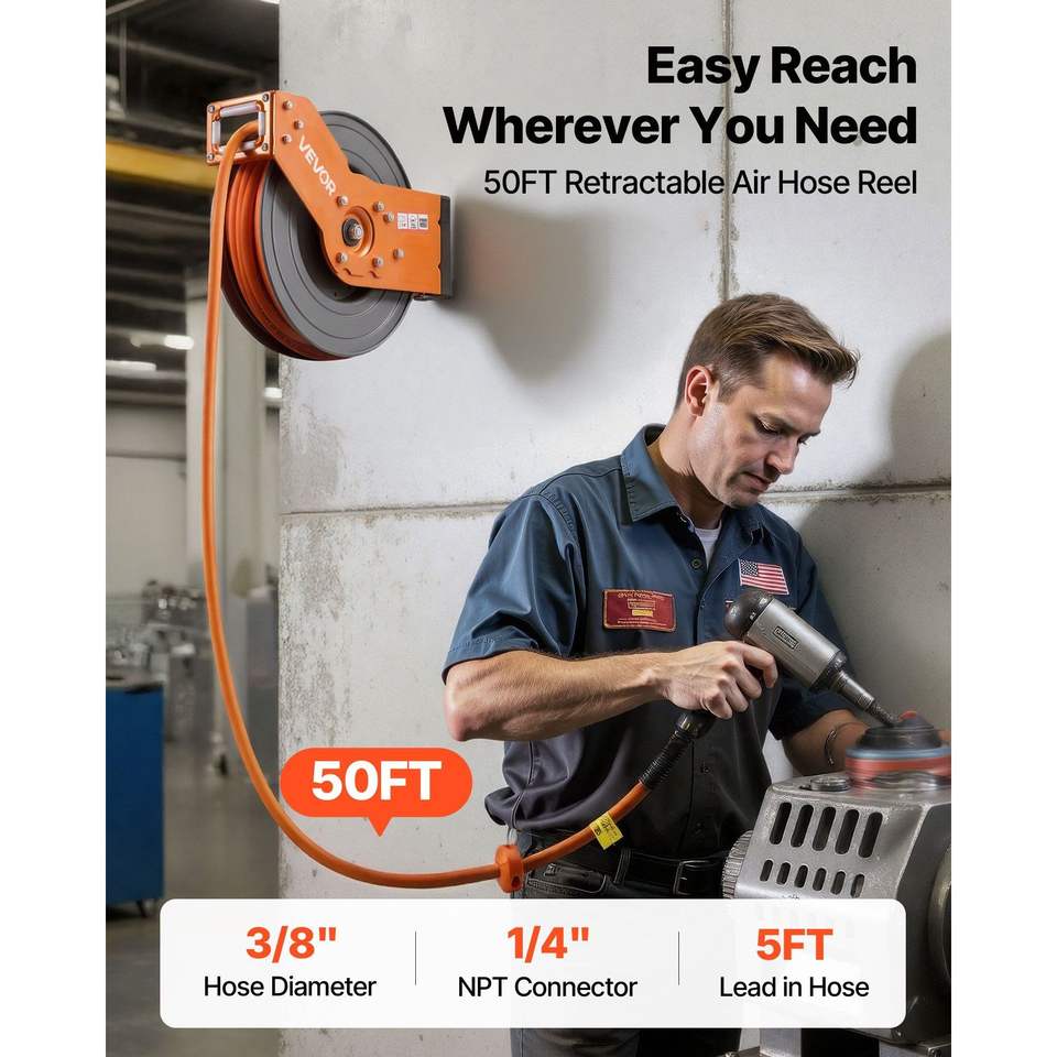 Hybrid 3/8 Inch X 50 FT Auto Rewind Air-Compressor Hose Reel 300PSI Max 5 ft Lead Retractable Air Ratchets