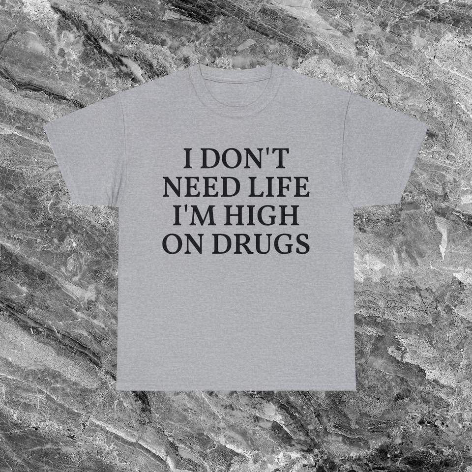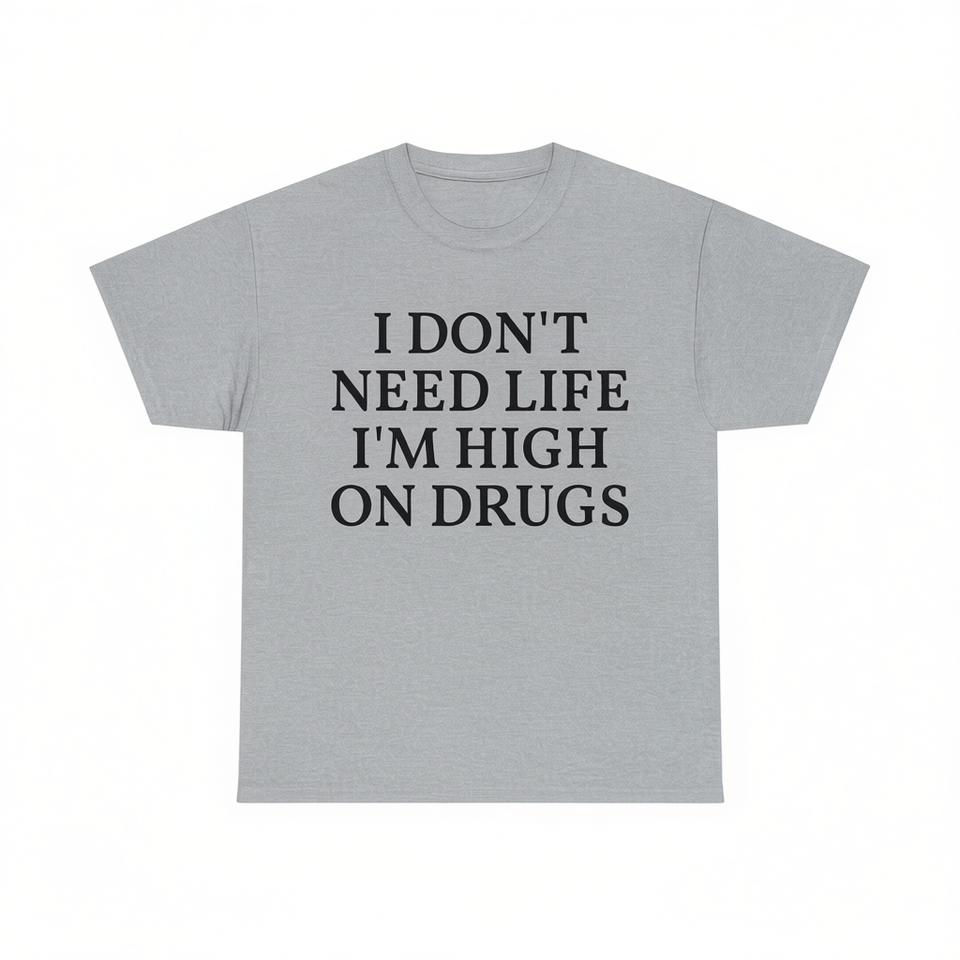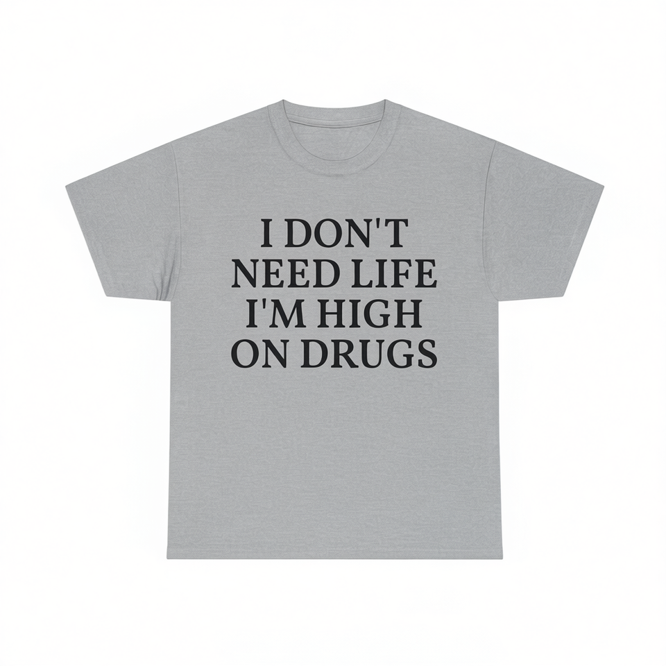 T-shirt unisex in cotone con scollo rotondo e maniche corte, con stampa divertente e sarcastica: "Non ho bisogno della vita, sono drogato a morte".