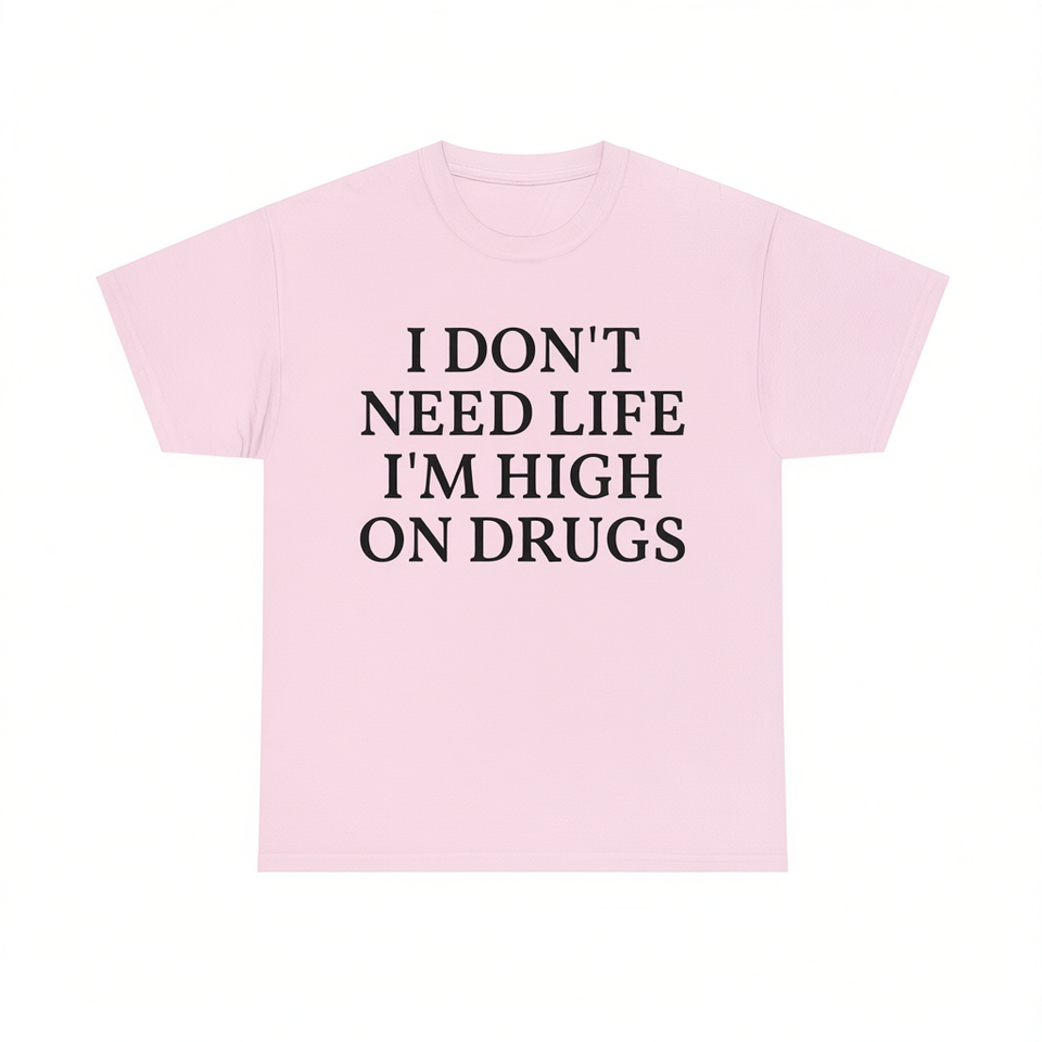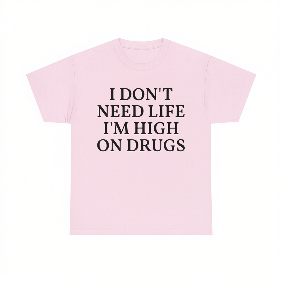T-shirt 'Non ho bisogno della vita, sono drogato' - Maglietta divertente con meme, ironica e sarcastica, abbigliamento per rave