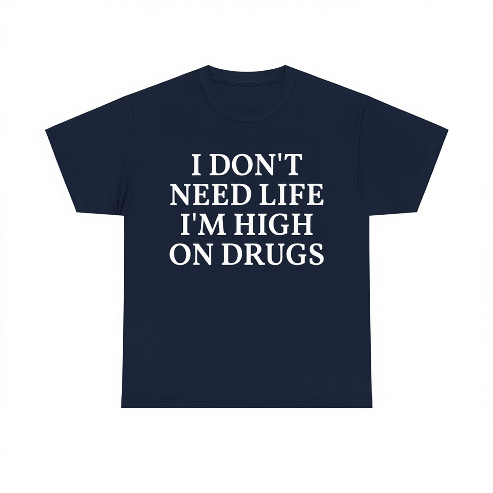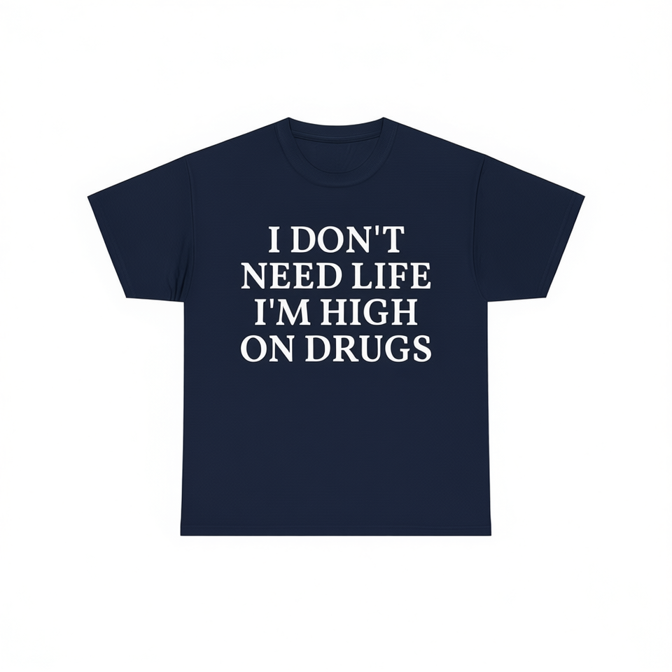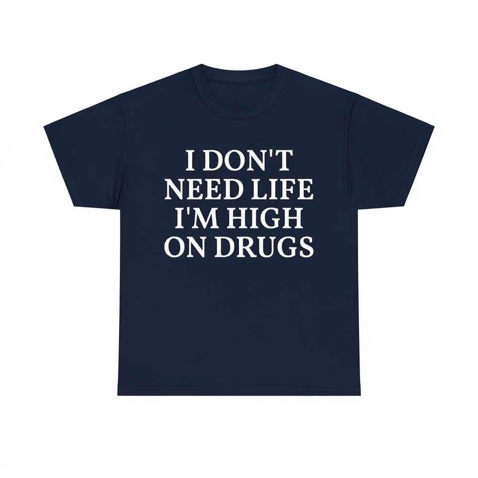 T-Shirt Unisex 'Non Ho Bisogno della Vita, Sono Alto in Droga' con Stampa Serigrafica, Manica Corta, Collo Rotondo, Maglietta Promozionale