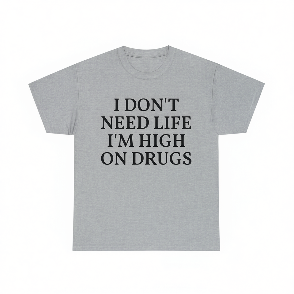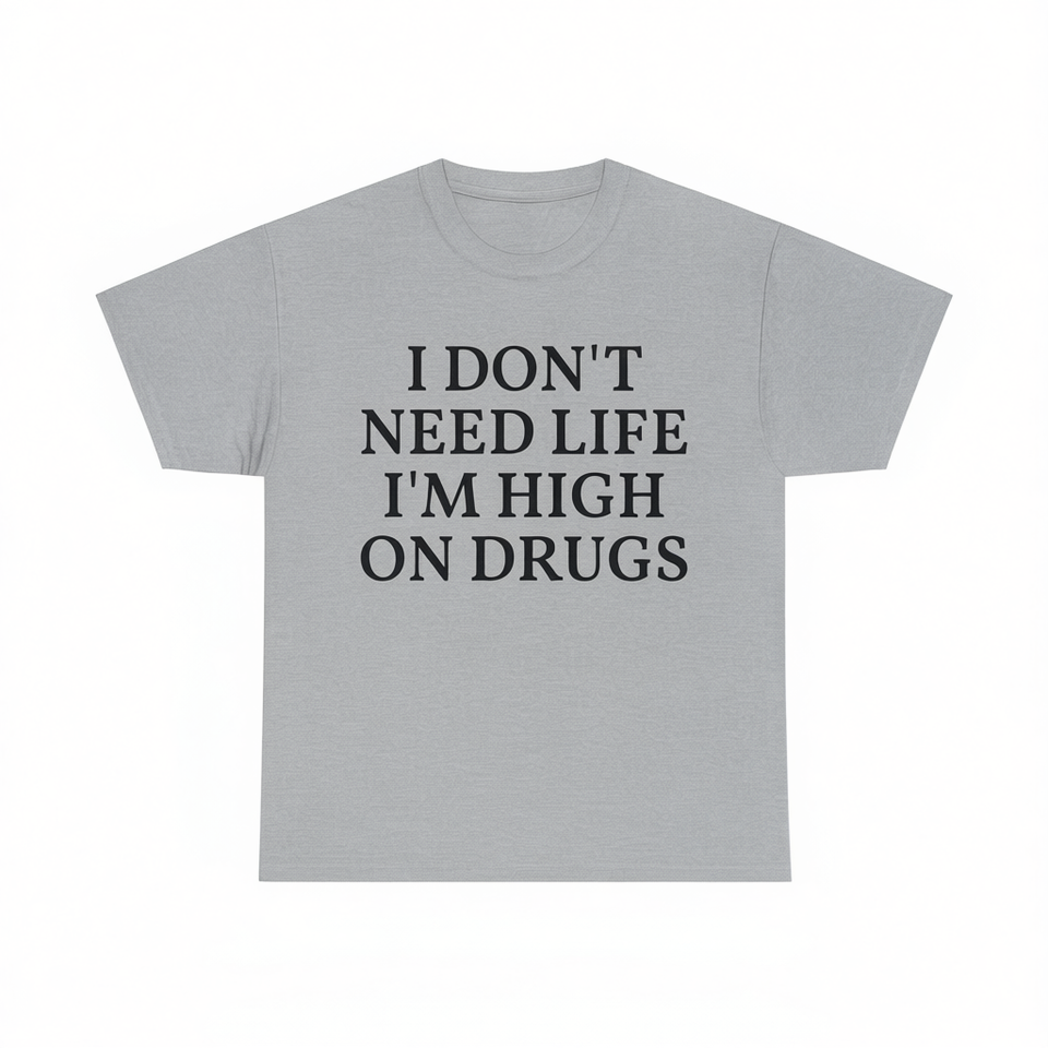 T-shirt unisex in cotone a maniche corte con scollo rotondo, stampa 'I Don't Need Life I'm High On Drugs', abbigliamento promozionale