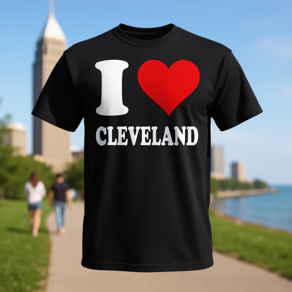 T-shirt I Love Cleveland con design a cuore rosso, maglietta promozionale nera da uomo